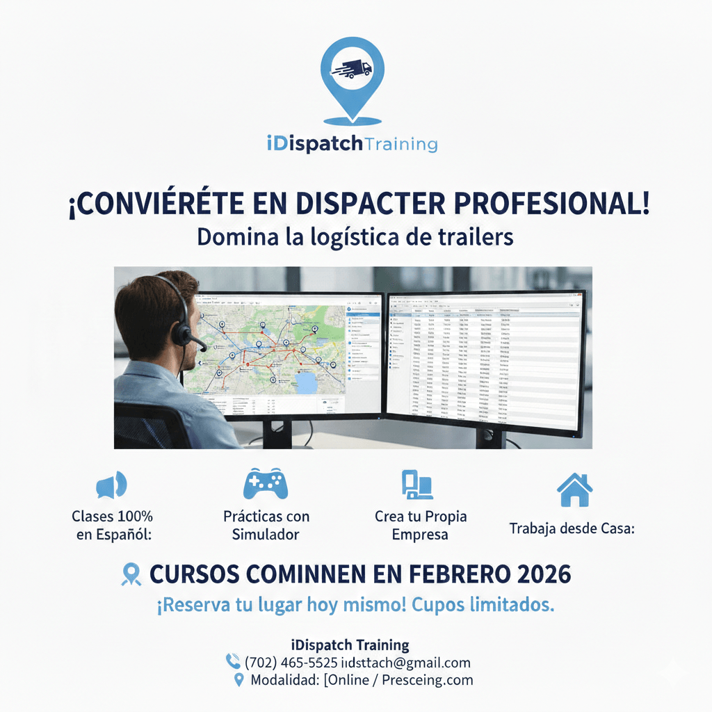 Aprende una de las habilidades más demandadas en la industria del transporte en Estados Unidos, sin experiencia previa y desde cualquier país. Nuestro entrenamiento práctico te lleva paso a paso desde cero hasta estar listo para trabajar como dispatcher remoto, con clases en vivo, ejercicios reales y acompañamiento personalizado.